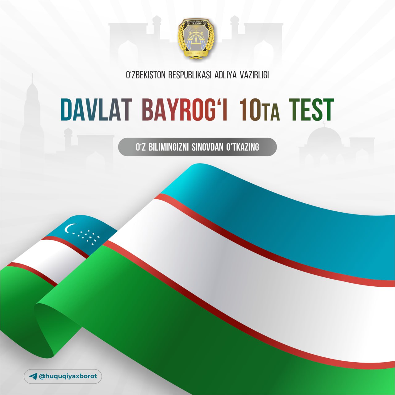 18-noyabr – O'zbekiston Respublikasi davlat bayrog'i qabul qilingan kun munosabati bilan Adliya vazirligi tomonidan o'tkazilayotgan test sinovida faol ishtirok eting.