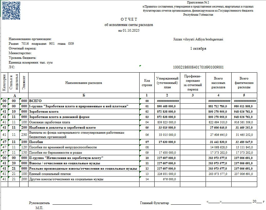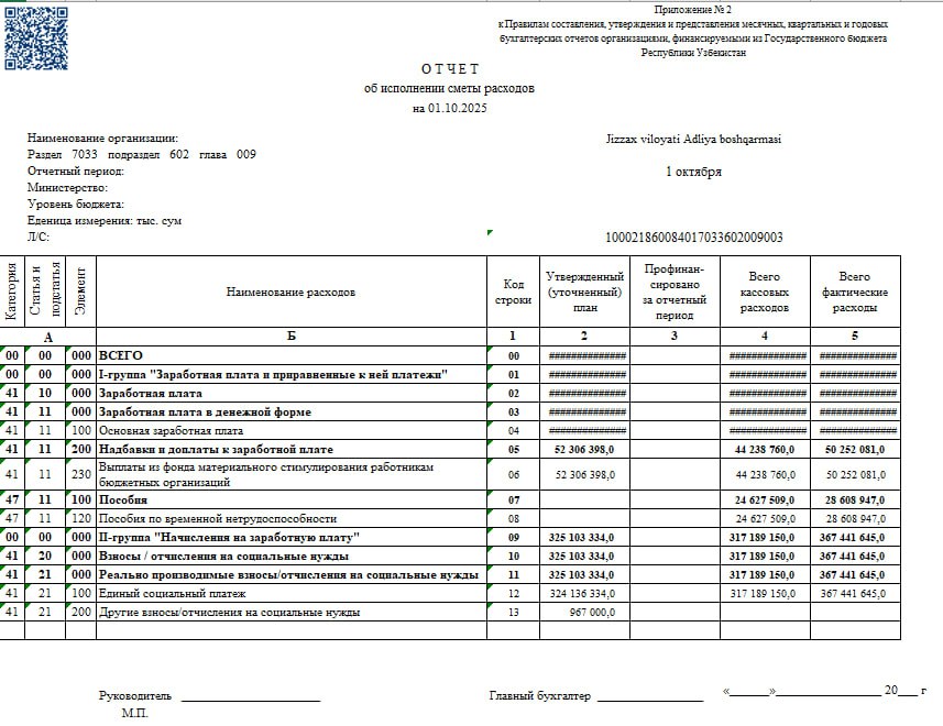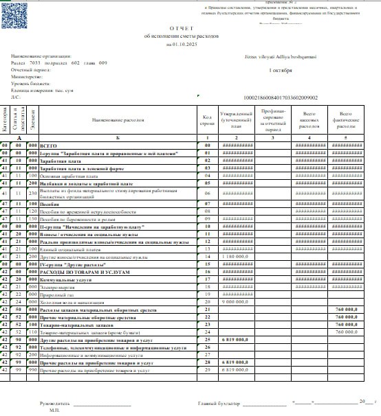 Хarajatlar smetasining bajarilishi to'g'risidagi hisobot